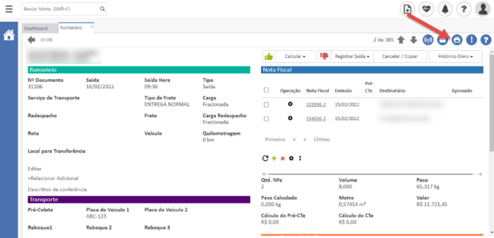 - Para imprimir, basta acessar o romaneio e clicar no ícone de impressora: