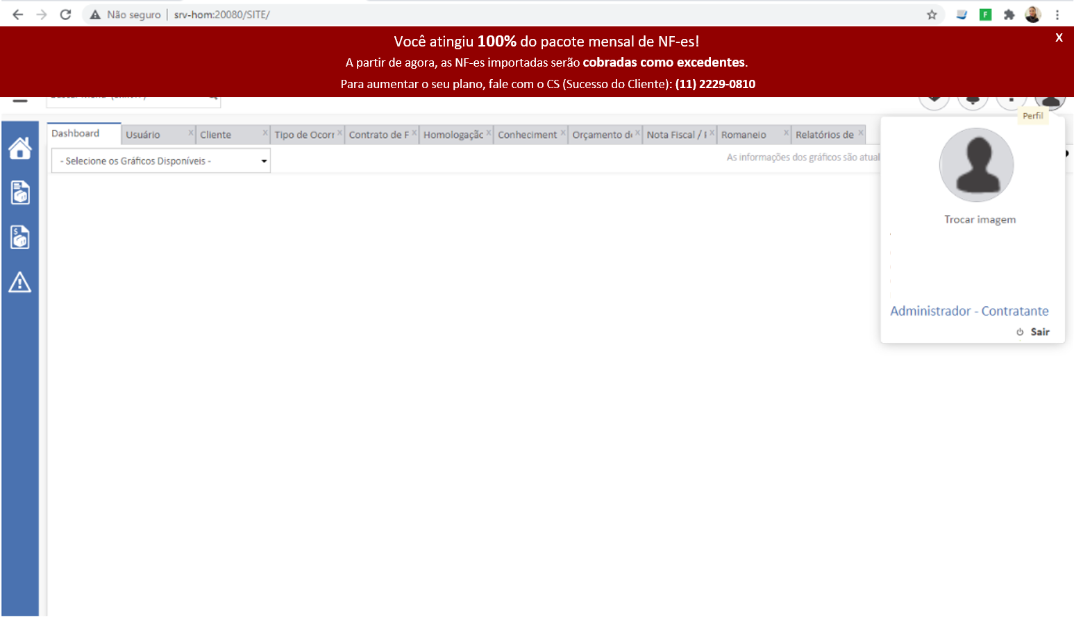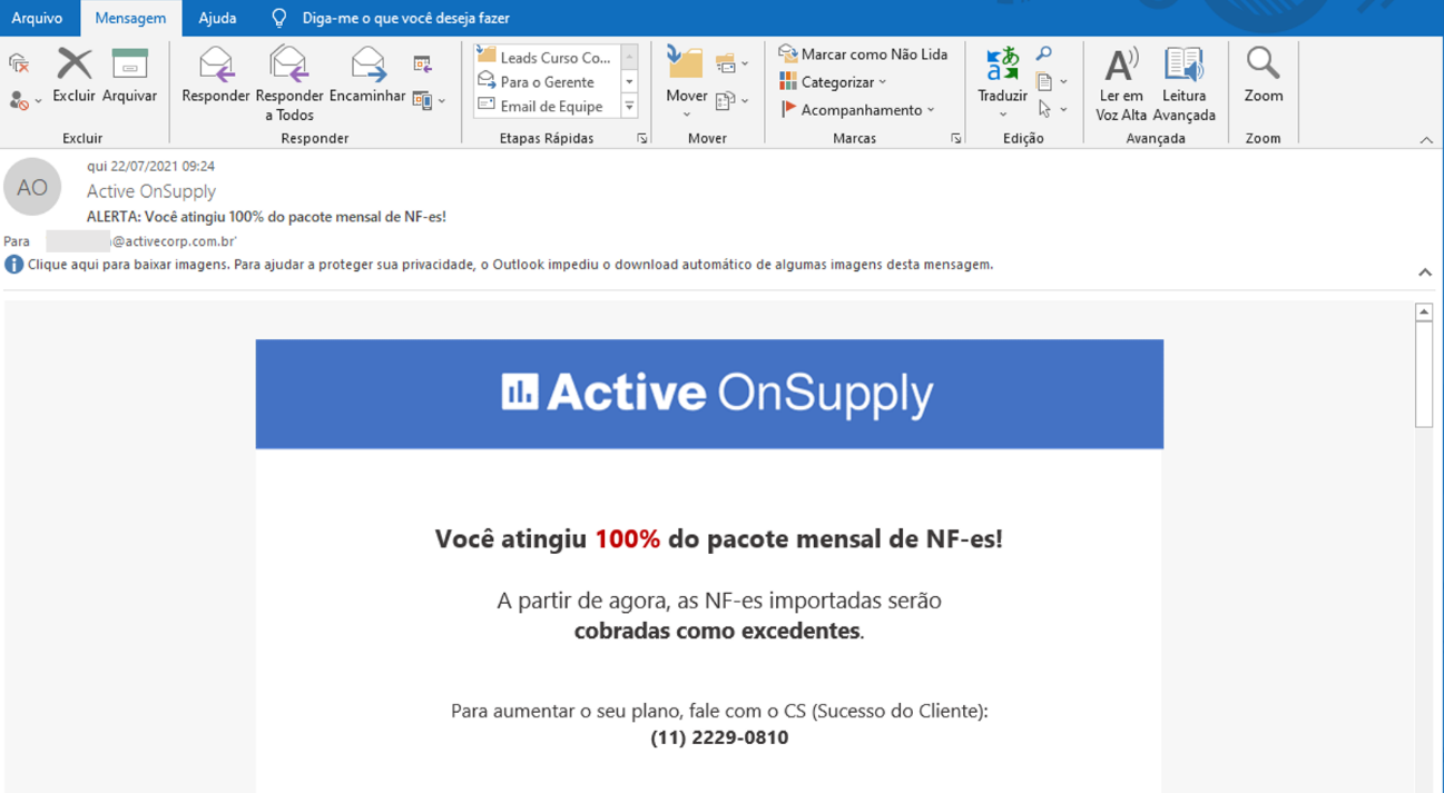 Assim, você não precisa se preocupar em gerar relatórios para checar se você está atingindo o limite de notas contratadas, nem será pego de surpresa com cobranças de excedentes no final do mês! O Active OnSupply avisará na tela quando você atingir 80% e 100% do limite de notas contratadas, enviando também uma notificação por e-mail para o usuário gestor.