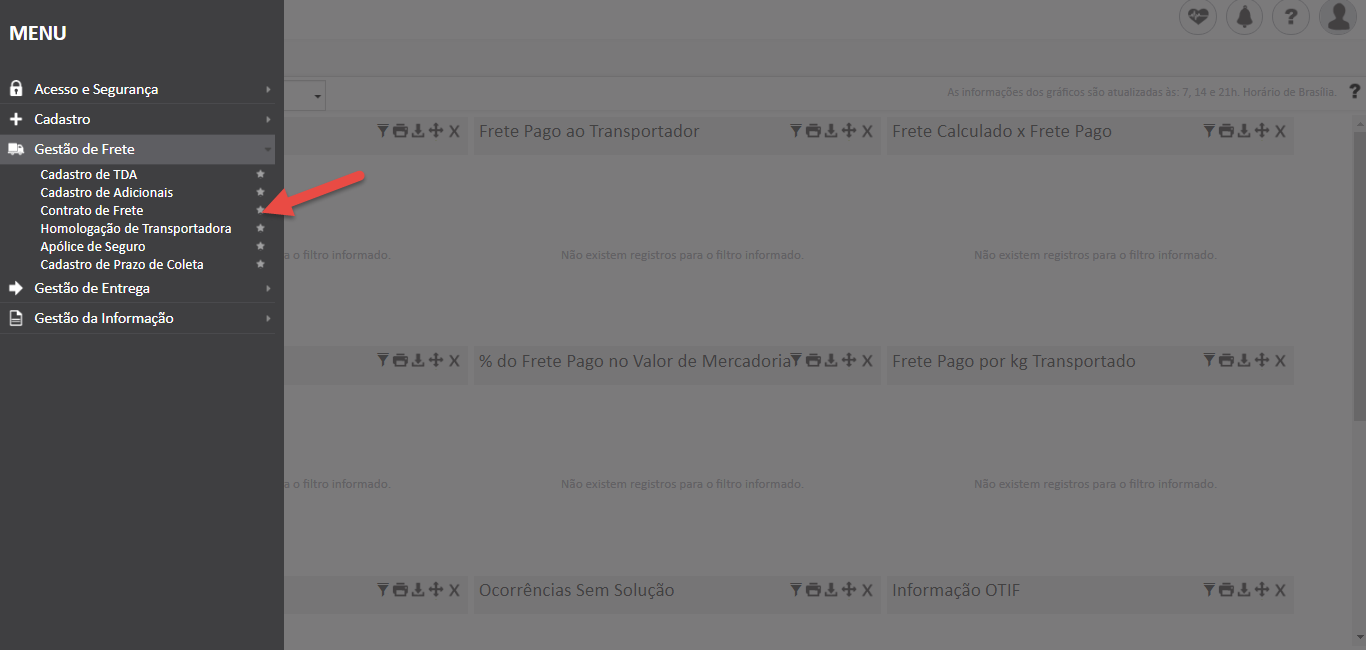 - Acesse a tela “Contrato de Frete” no menu “Gestão de Frete”;