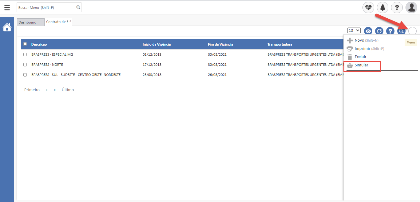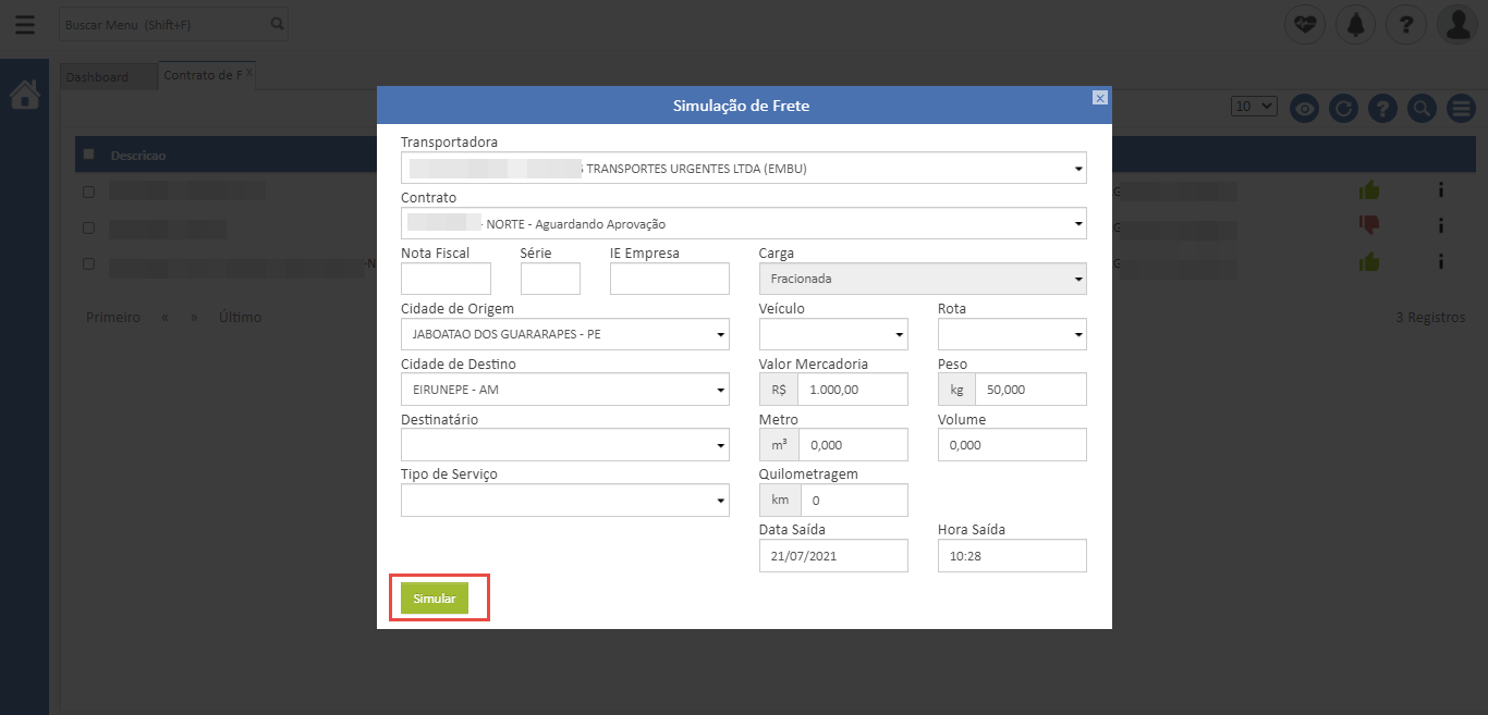 - Preencha as informações necessárias, indicando a transportadora, contrato e dados do frete e clique em “Simular”;