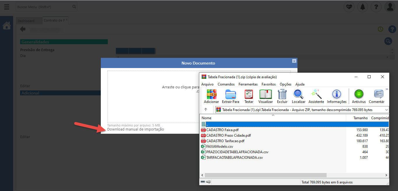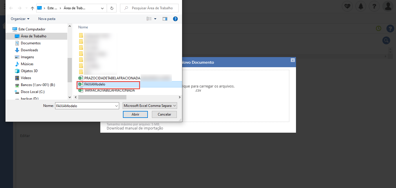 - Importante: Para importar as tabelas por csv, os arquivos deverão seguir as orientações dadas no manual e modelos disponibilizados. Deve-se importar primeiramente o arquivo referente as faixas, em seguida as tarifas e por último os prazos. Para visualizar o manual e modelos dos arquivos, basta clicar em “Download manual de importação”.