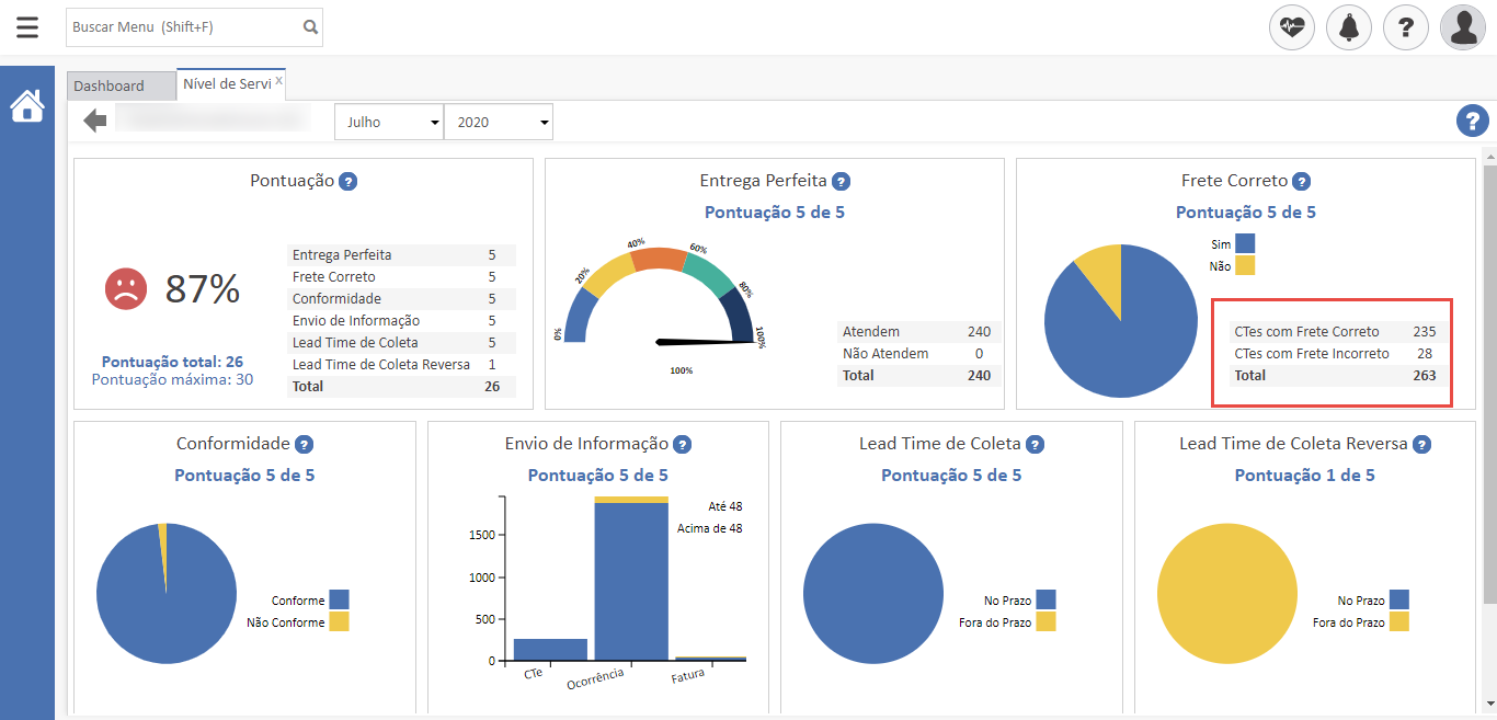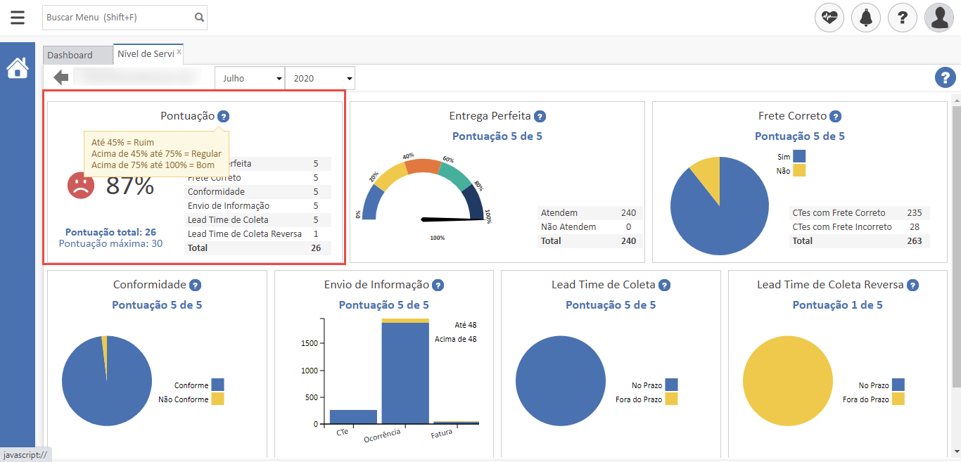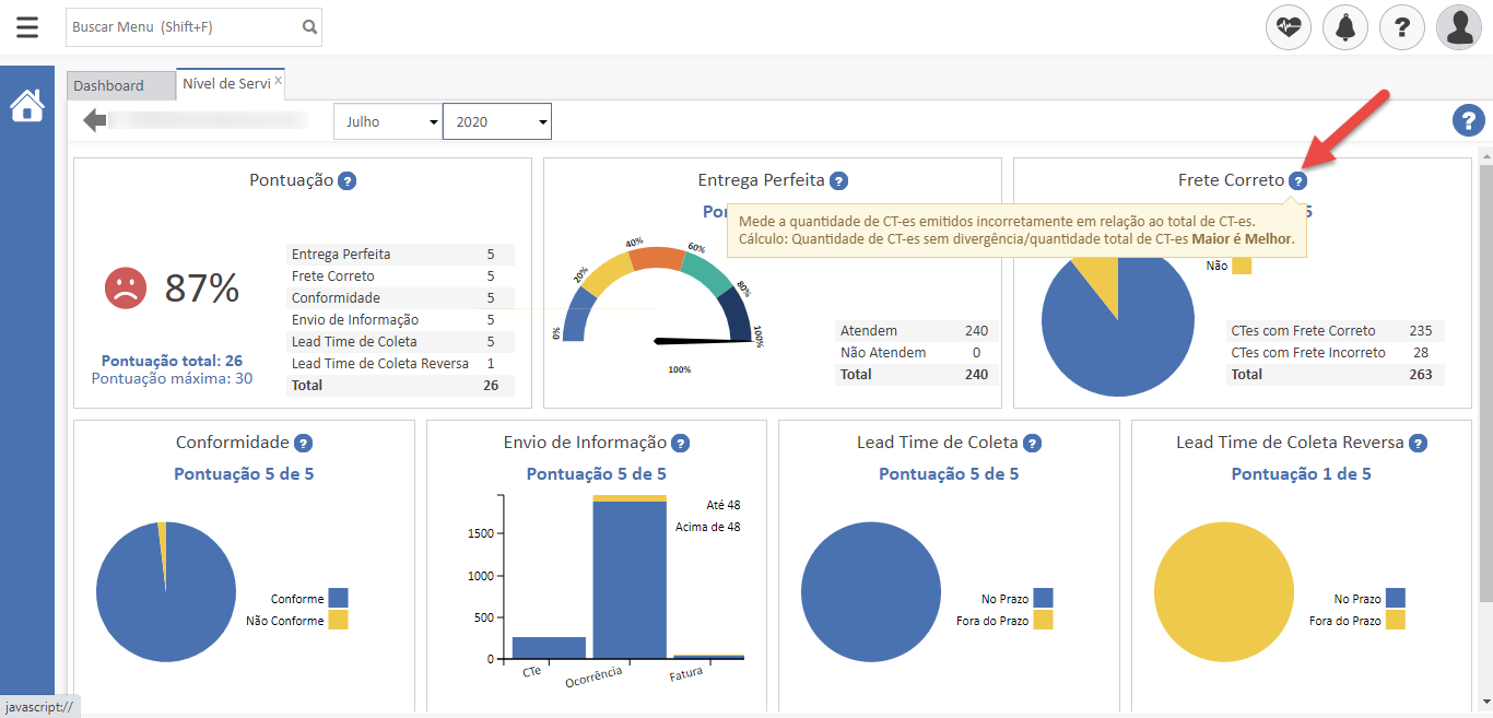 - A pontuação alcançada pela transportadora é apresentada logo abaixo do título do indicador. Você também pode verificar o percentual alcançado clicando na pontuação;