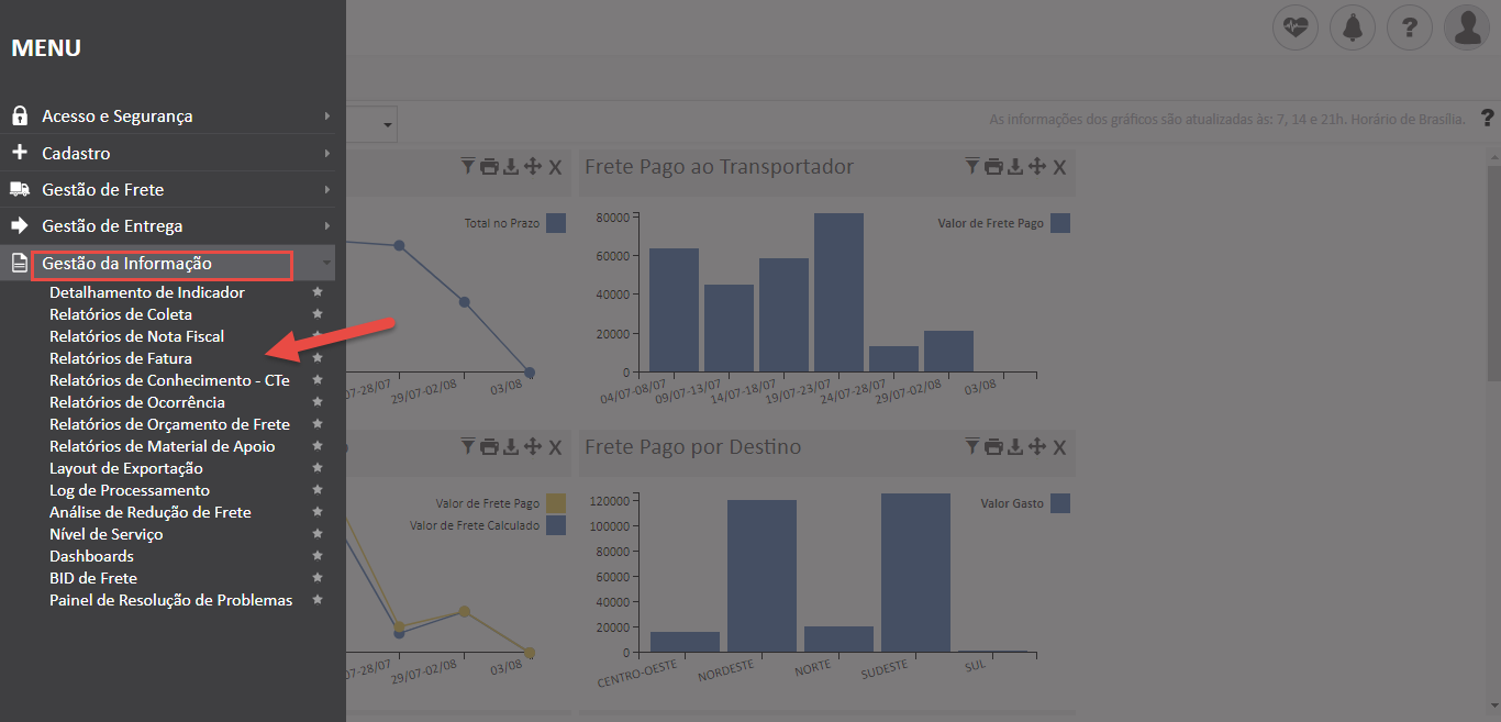 - Acesse a tela “Relatórios de Fatura” no menu “Gestão da Informação”;