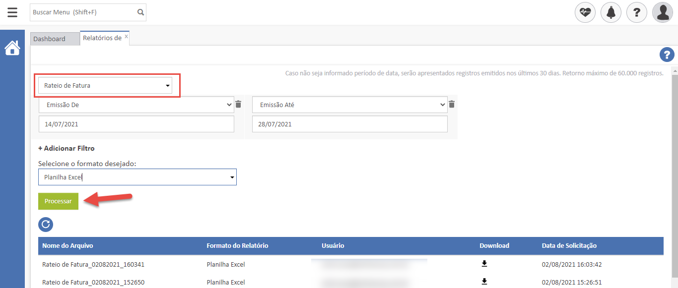 - Selecione a opção “Rateio de Fatura” e informe os filtros desejados. Neste exemplo, utilizamos apenas os filtros de data de emissão.