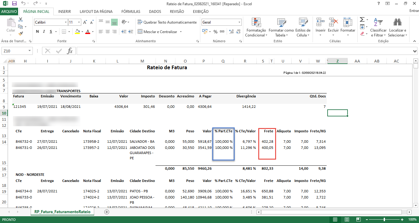 - O percentual de participação das notas no CT-e é apresentado na coluna “%Part.Cte”. Se o CT-e tiver uma única nota fiscal, o percentual apresentado será 100%.