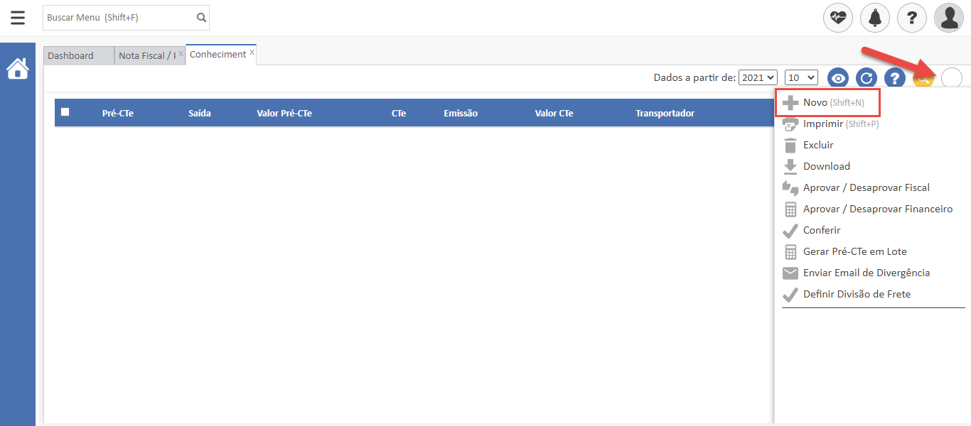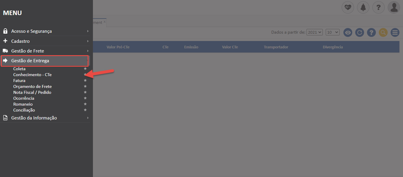 - Acesse a tela “Conhecimento – CTe” no menu “Gestão de Entrega”;