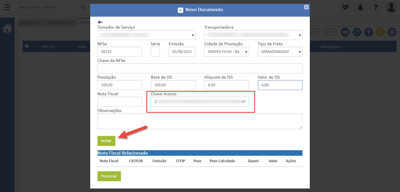 - Preencha as informações e após incluir a chave da Nota Fiscal clique em “Incluir”;