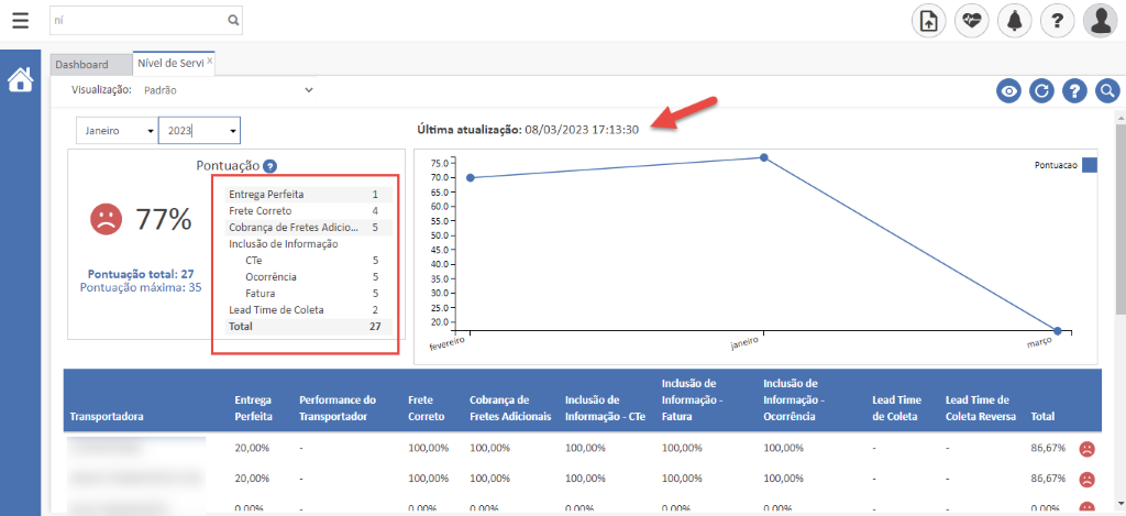 Essa informação é apresentada logo ao acessar a tela de Nível de Serviço, onde você também pode visualizar um gráfico das pontuações mensais da sua empresa.