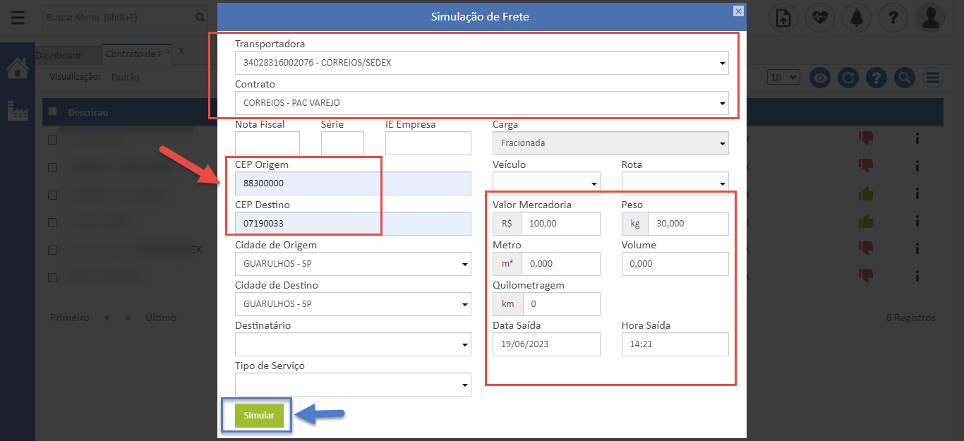 - Informe a transportadora e qual tabela deseja utilizar para o cálculo. Em seguida, preencha qual o CEP de origem e destino e os dados do frete;