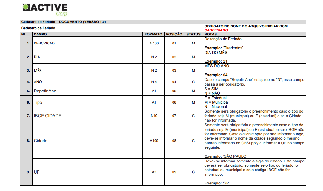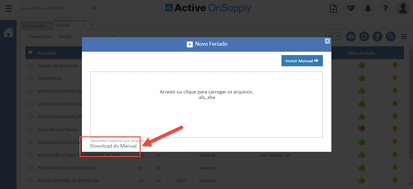 - Após ajustar o modelo, basta importar a planilha e pronto! Todos os feriados serão cadastrados, possibilitando que o Active OnSupply calcule a previsão de entrega de suas notas corretamente.