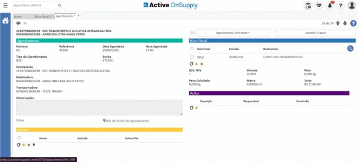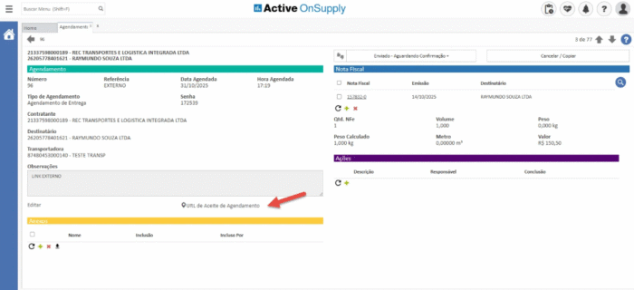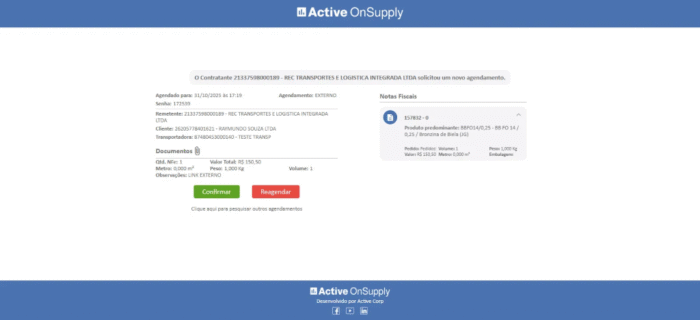 O link está disponível nos e-mails de solicitação e também na tela do agendamento no Active OnSupply.