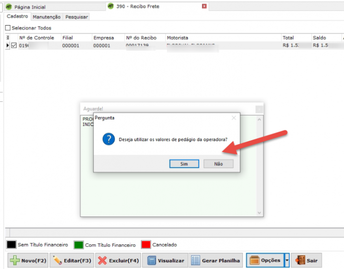 Na tela de “Recibo Frete”, ao emitir o CIOT, o Active Trans fará a pergunta: “Deseja utilizar os valores de pedágio da operadora?”