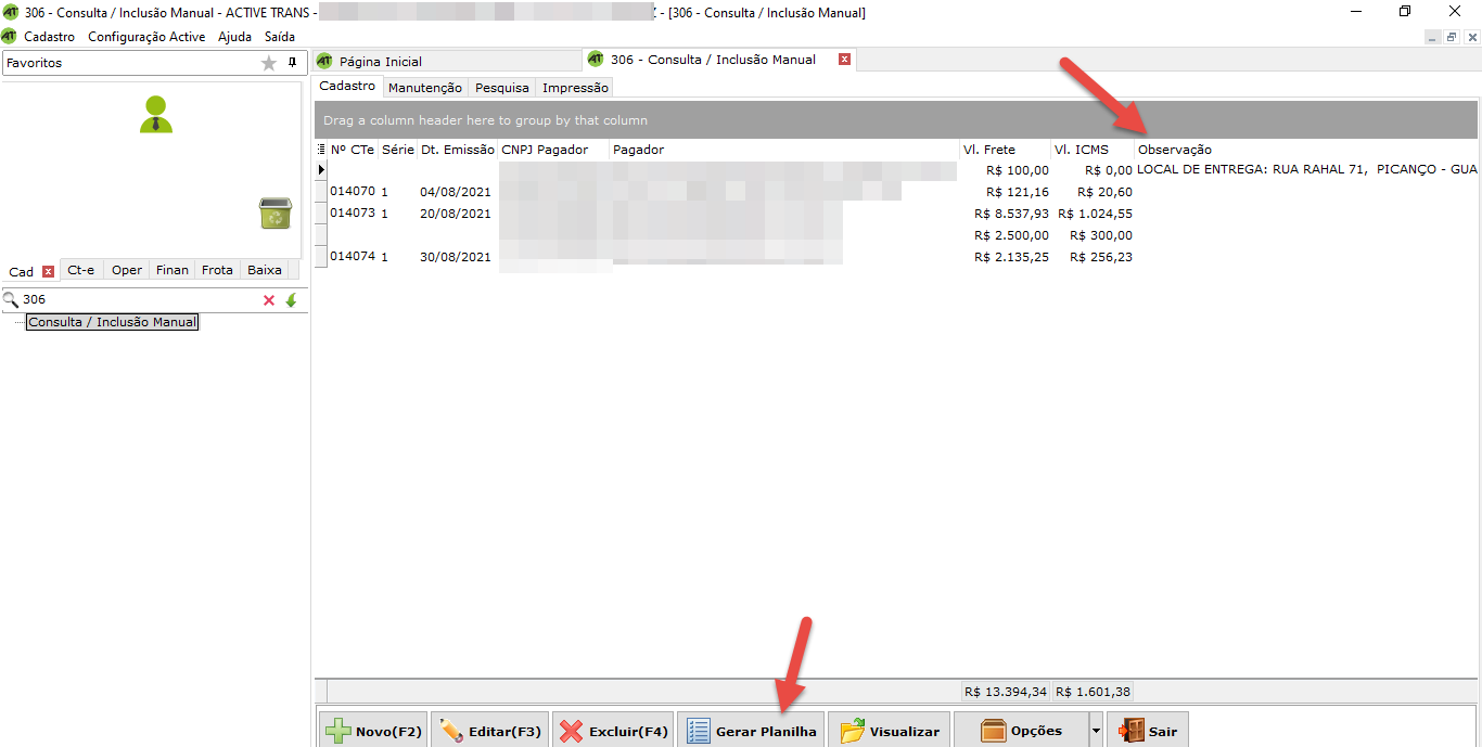 - Consulte a observação de seus CT-es na tela de Consulta/Inclusão Manual