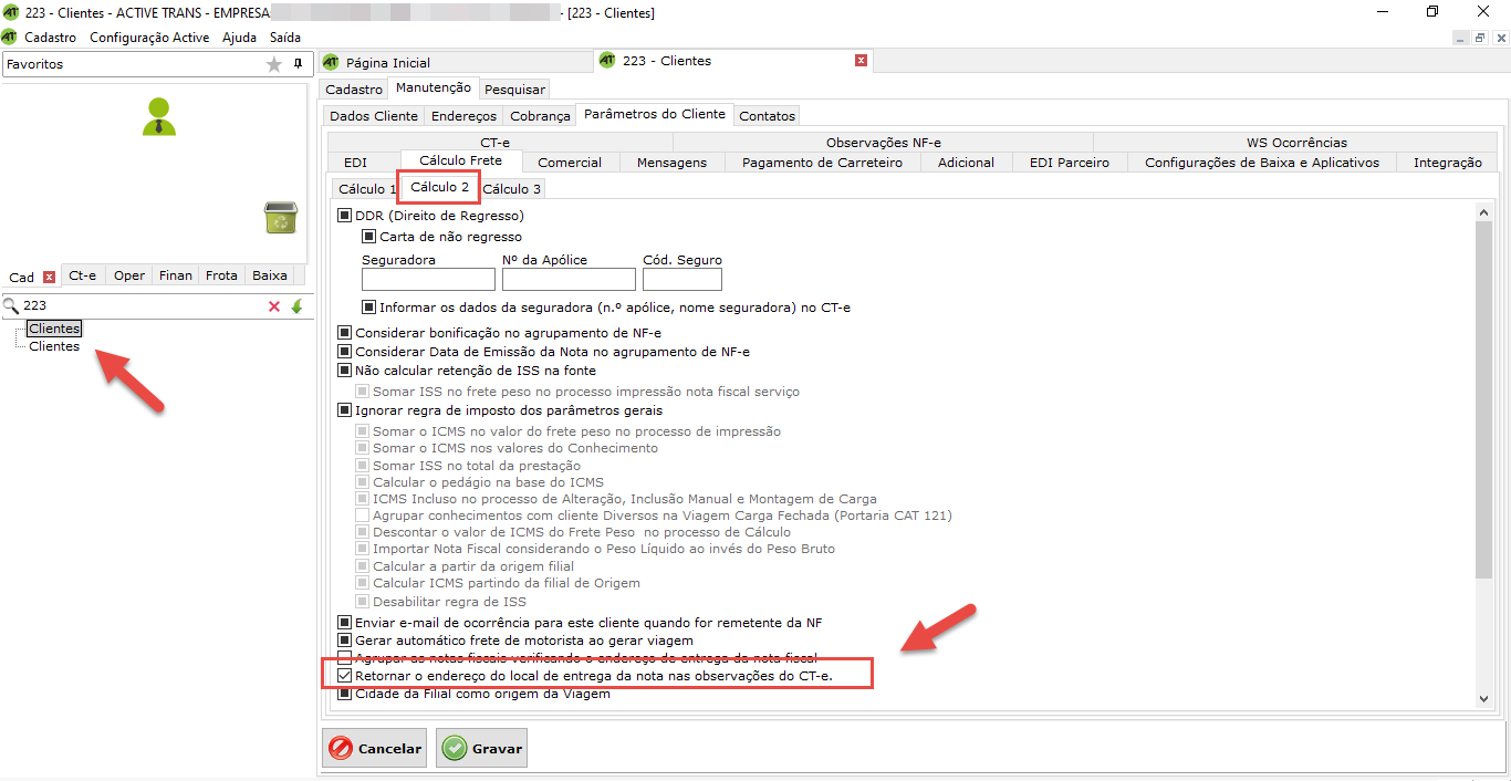 Para utilizar essa facilidade, basta acessar o cadastro do cliente, marcar a regra “Retornar o endereço do local de entrega da nota nas observações do CT-e” e pronto!