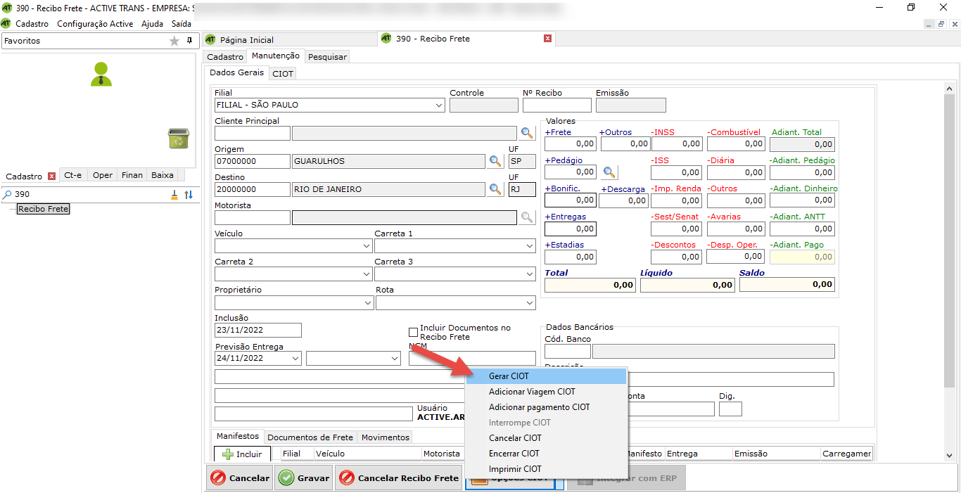 - Grave as sequências e pronto! O campo de pedágio será preenchido automaticamente com os valores retornados pela Target. Para finalizar a contratação do Vale Pedágio, basta clicar no botão “Opções” e em “Gerar CIOT”.