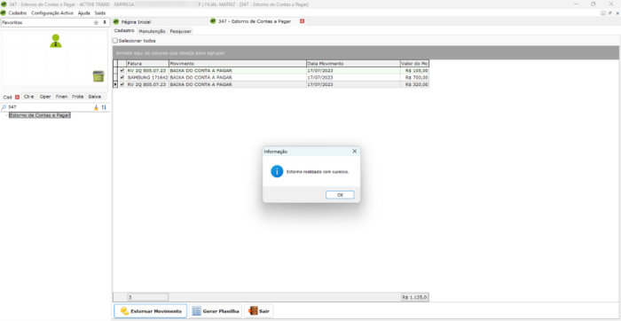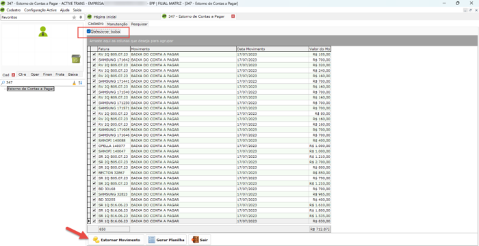 - Selecione os movimentos que deseja estornar e clique em “Estornar Movimento”: