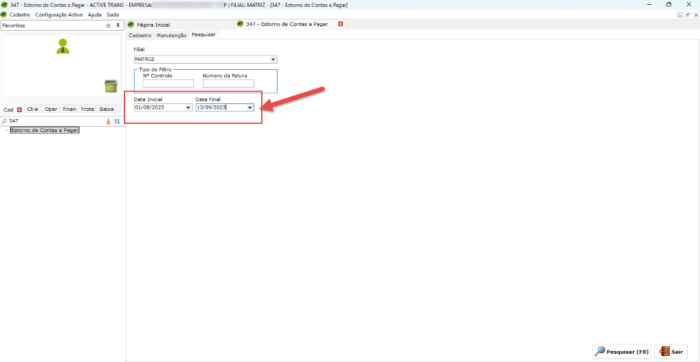 - Acesse a tela 347 – Estorno de Contas a Pagar, informe o período desejado e pesquise: