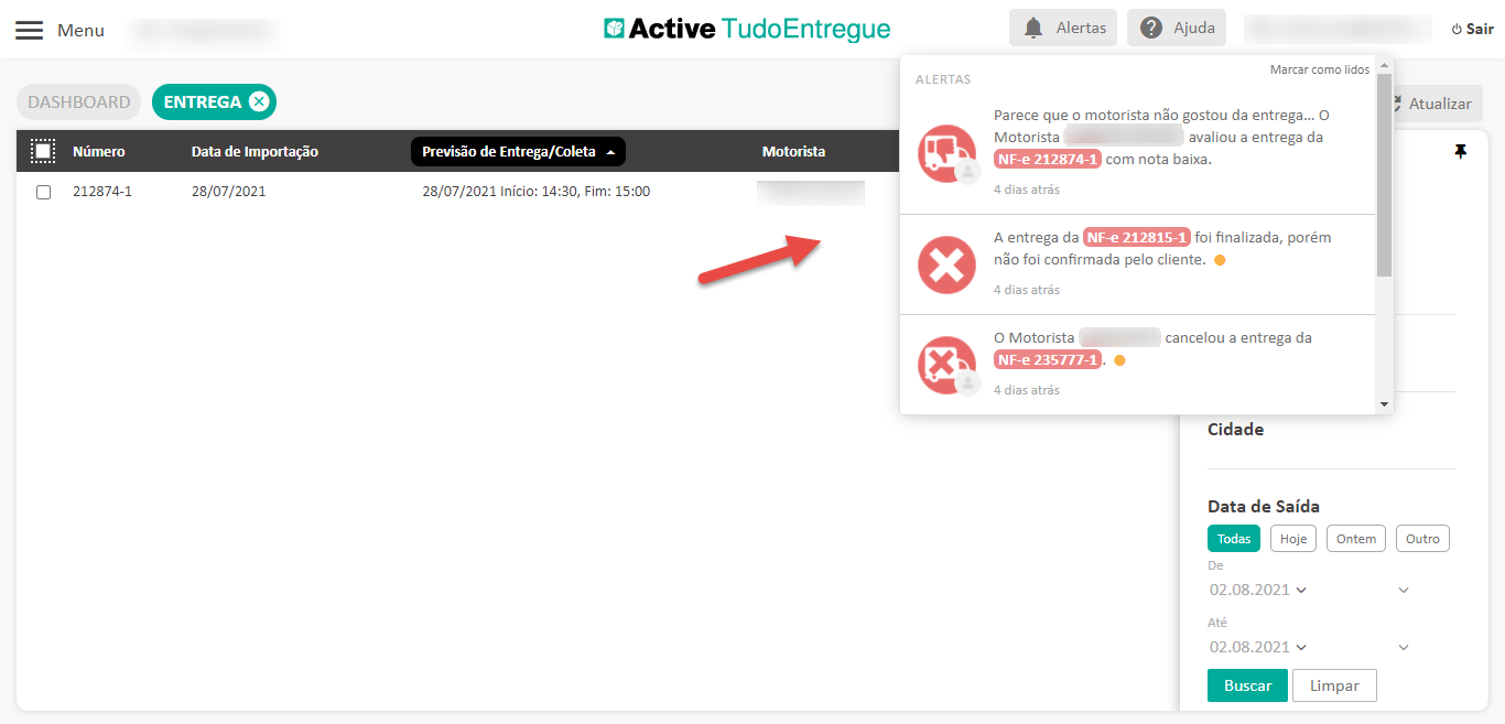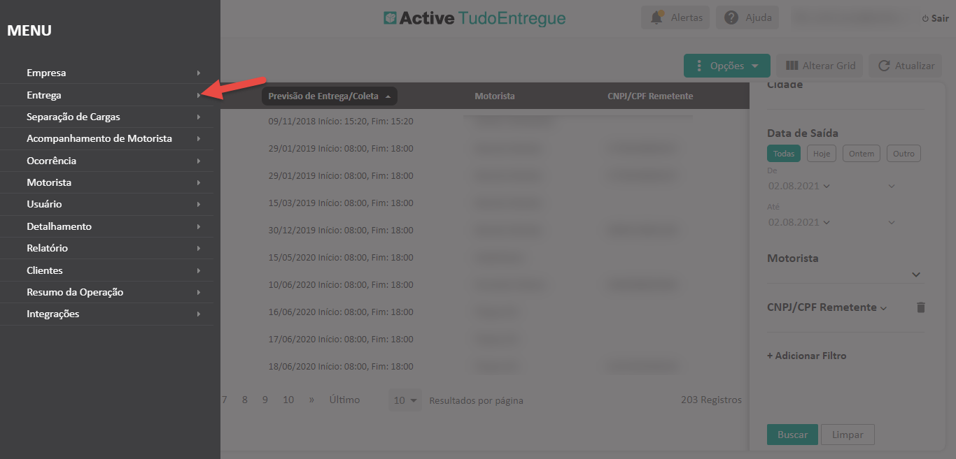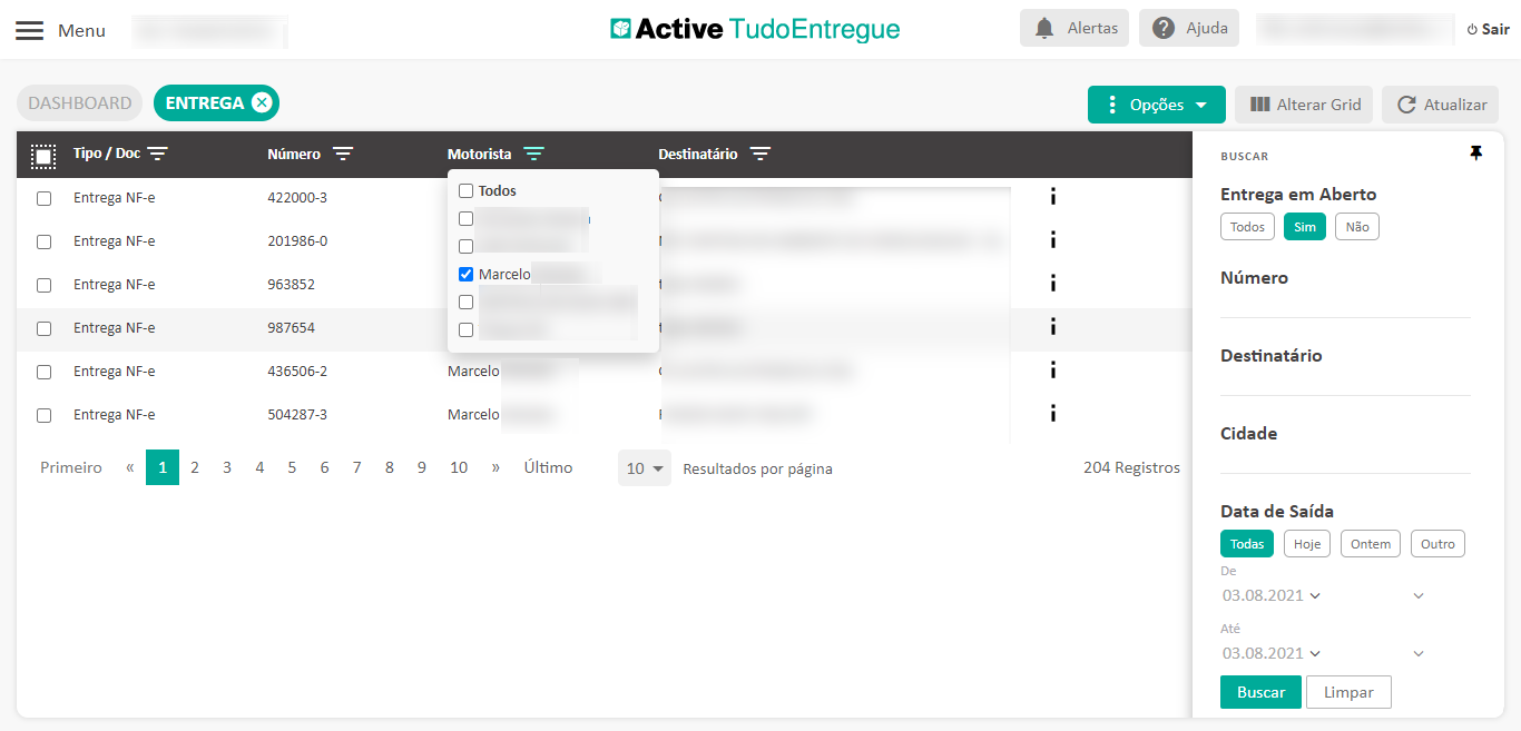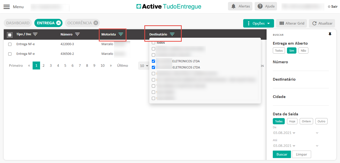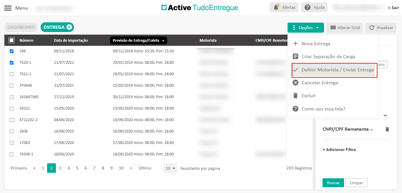- Clique no título da coluna “Motorista”, selecione o motorista desejado e pronto! O Active TudoEntregue mostrará somente as entregas do motorista escolhido.