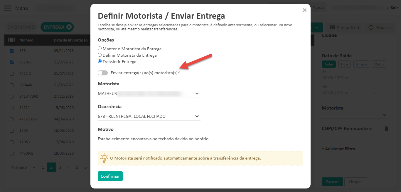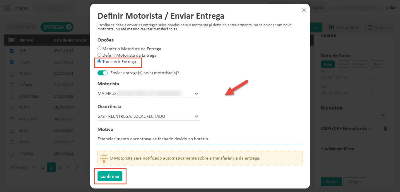 Agora, além de conseguir encaminhar com facilidade essas entregas para o novo motorista, você também pode lançar uma ocorrência e informar o motivo da transferência para que, posteriormente, você e outros colaboradores possam identificar rapidamente as causas da mudança.
