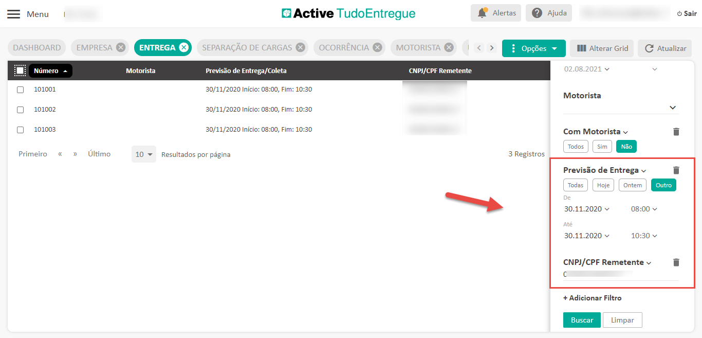 - Em seguida, filtre as entregas desejadas que serão distribuídas aos motoristas. Você pode filtrar pelo CNPJ da loja e janela de horário;