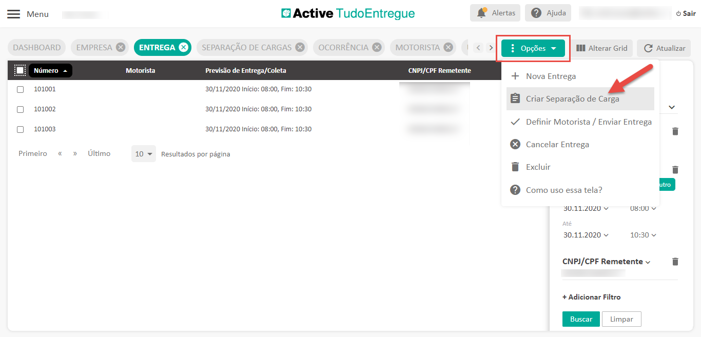 - Crie sua separação de cargas na tela de entregas