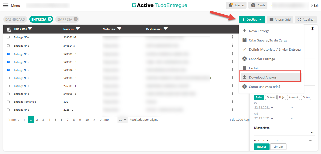 - Clique em “Opções” e em seguida em “Download Anexos”. Assim, os todos os anexos vinculados as Entregas serão baixados.