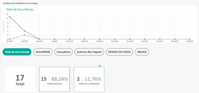 Com o novo dashboard disponível no menu lateral, você acompanha em tempo real os principais problemas ocorridos nas entregas, com filtros por data, tipo de problema e motorista.