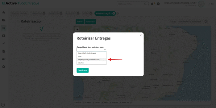 - Resumo completo da rota (peso, valor, volumes, KM e tempo);