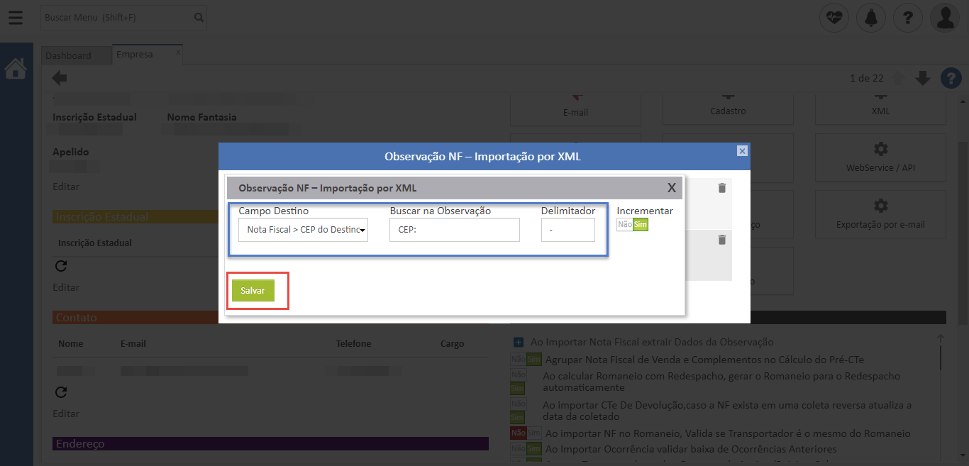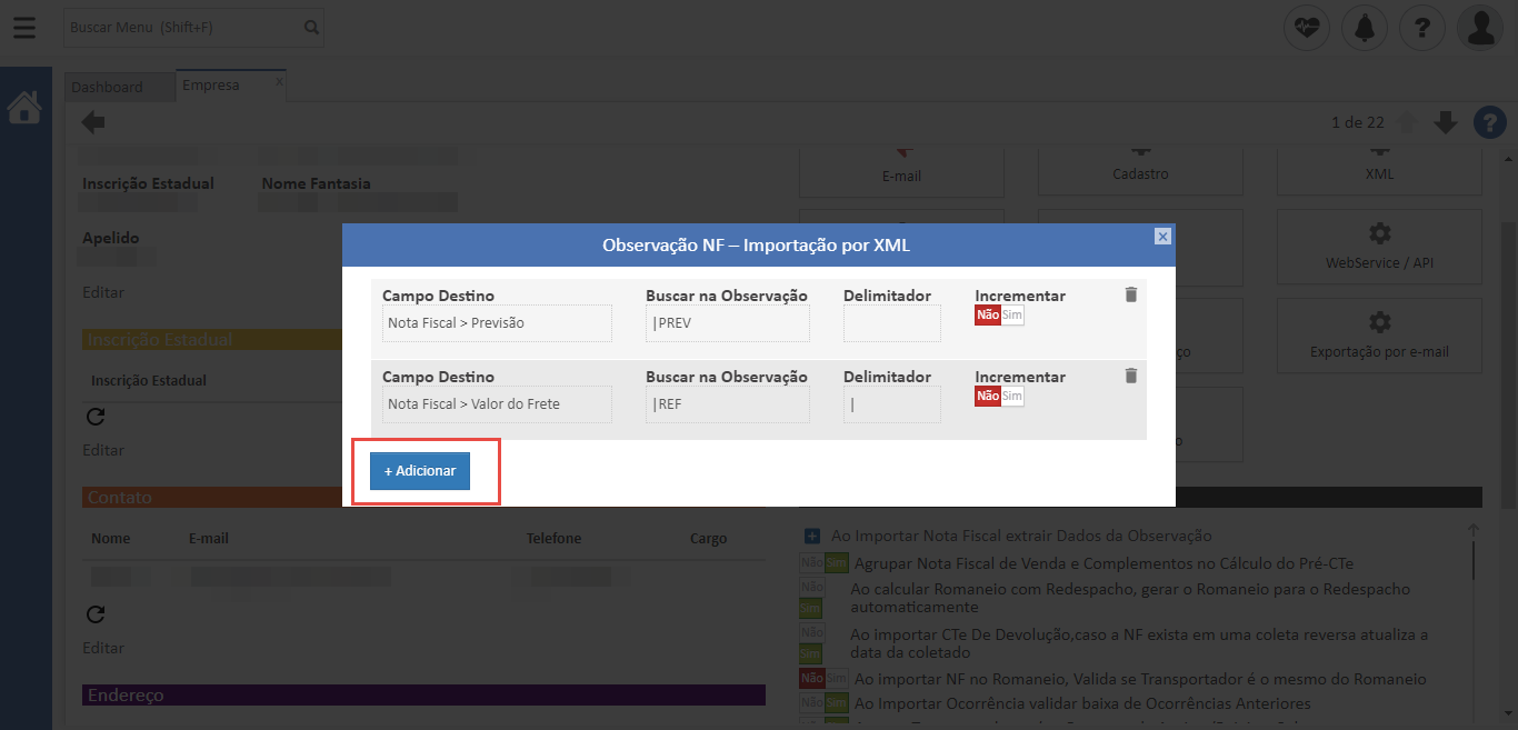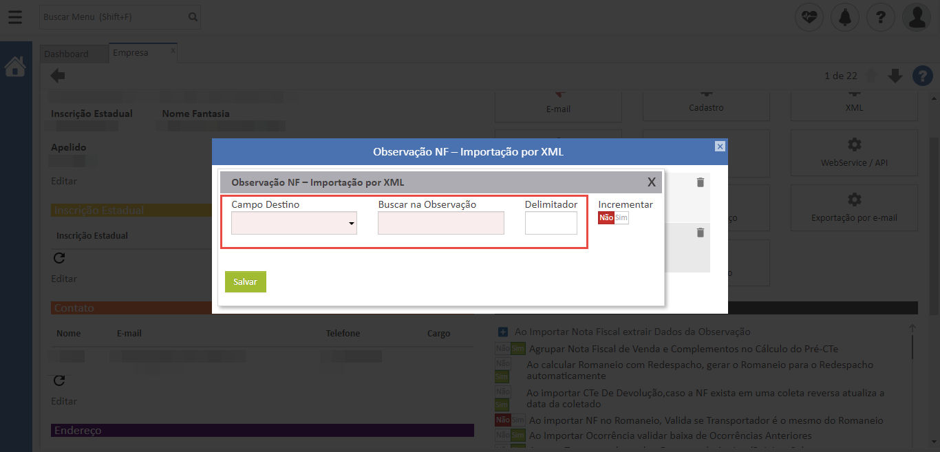 Agora, é possível configurar para que sempre que uma Nota Fiscal for importada por XML, as informações incluídas nas observações do arquivo sejam reconhecidas e preenchidas no campo desejado na tela de Nota Fiscal / Pedido. Assim, caso você já informe o endereço de entrega nas observações das suas notas, você pode configurar para que ele seja sempre retornado na tela de Nota Fiscal / Pedido.