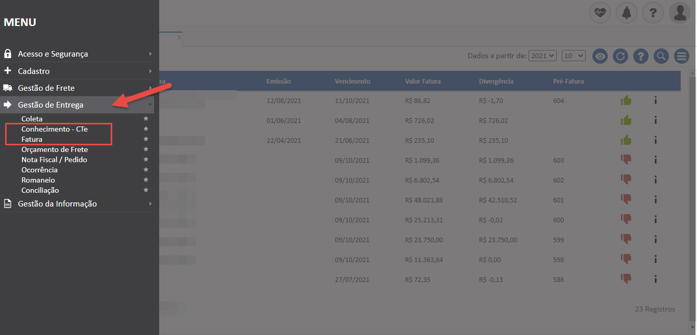 - Acesse a tela “Conhecimento – CT-e” ou “Fatura” no menu “Gestão de Entrega”;