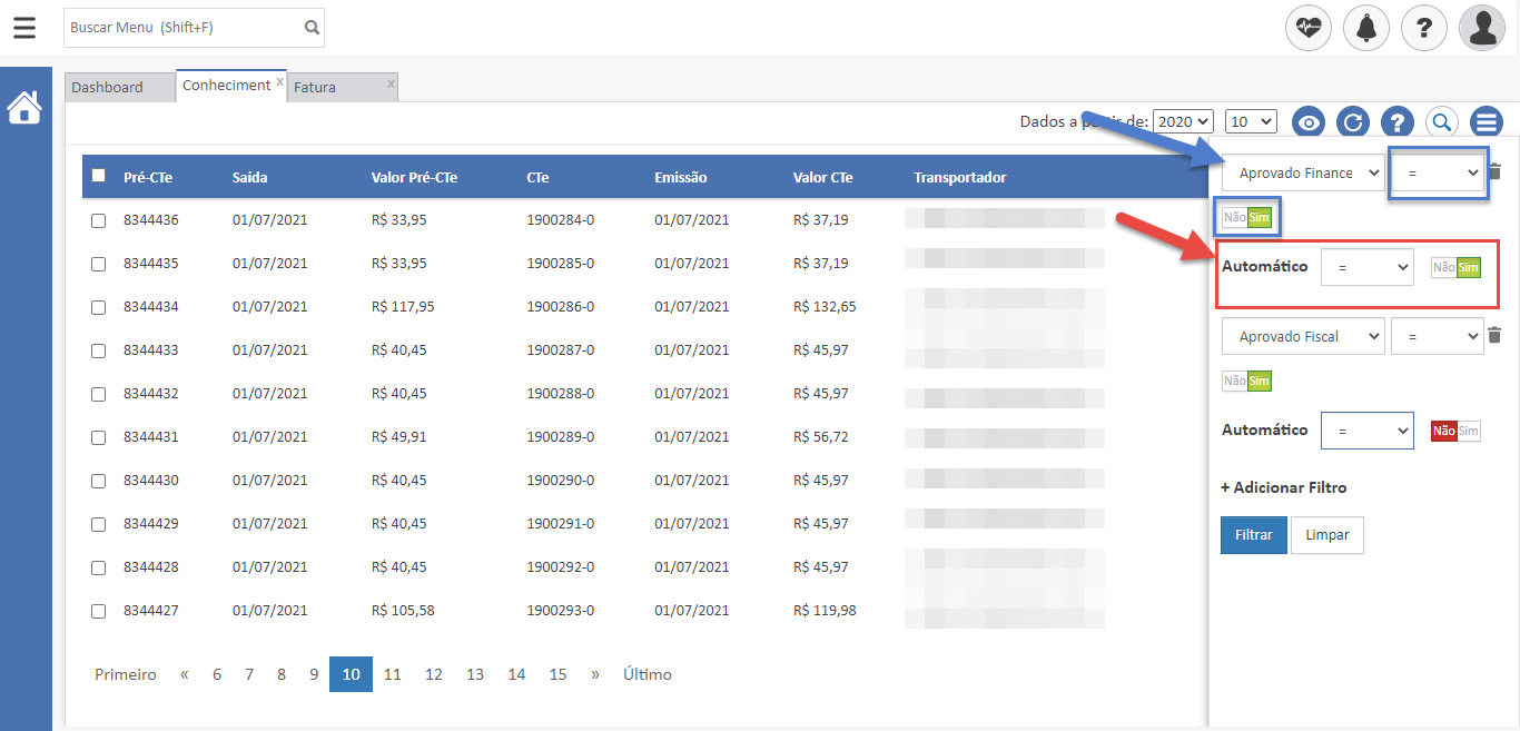 Através dos filtros de “Aprovação Financeira” e “Aprovação Fiscal” nas telas de “Fatura” e “Conhecimento – CT-e” você pode localizar esses documentos facilmente.