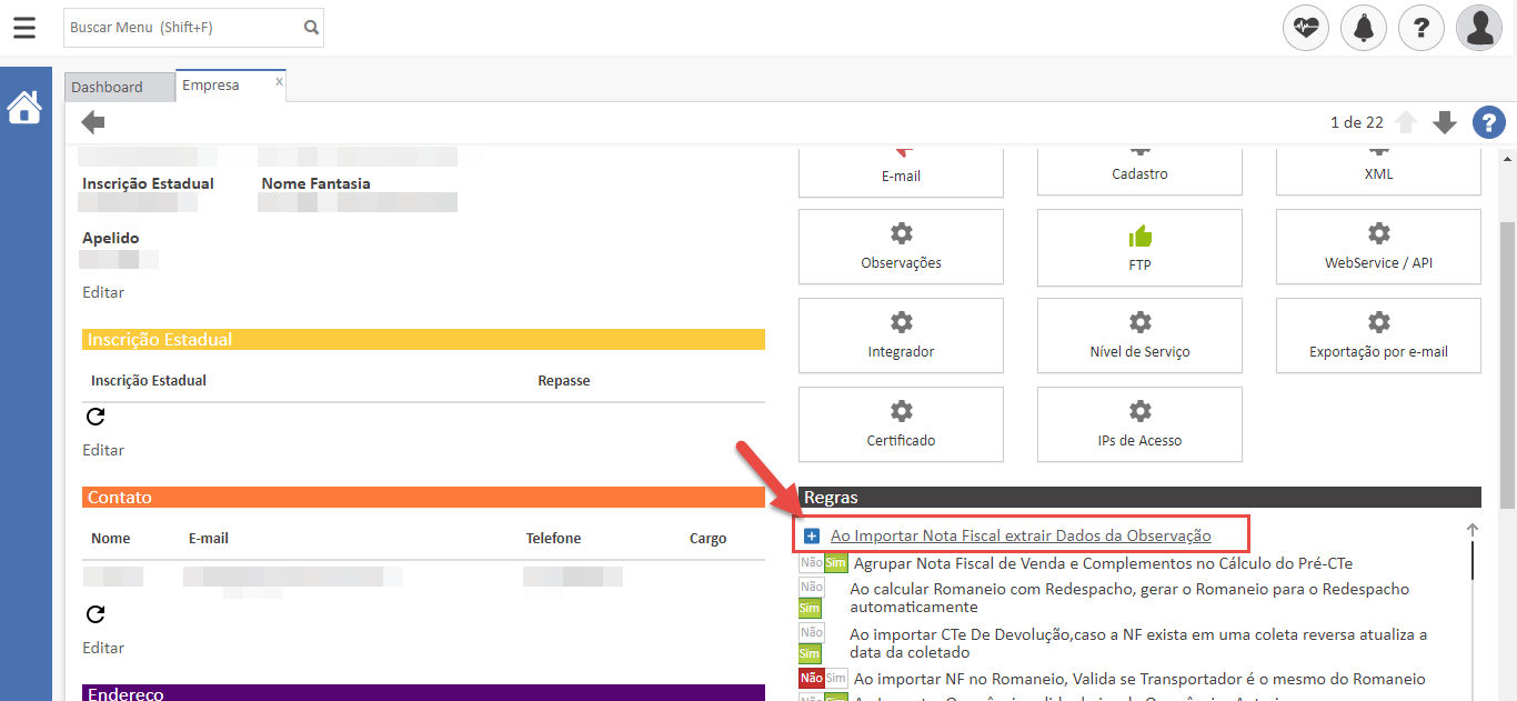 - Localize a filial desejada e após acessá-la, em “Regras” clique em “Ao Importar Nota Fiscal Extrair Dados da Observação”;