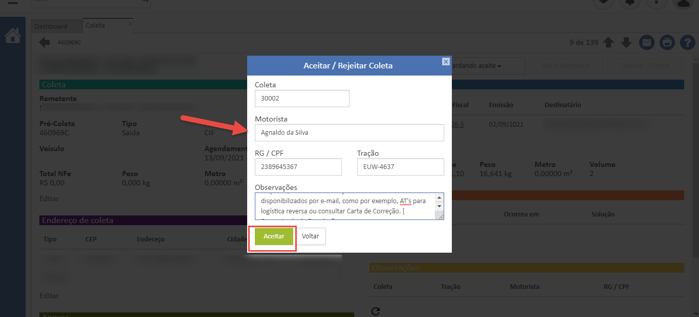 Para receber a informação, basta que no momento do aceite da coleta o transportador informe o nome e RG do motorista e a placa do veículo.