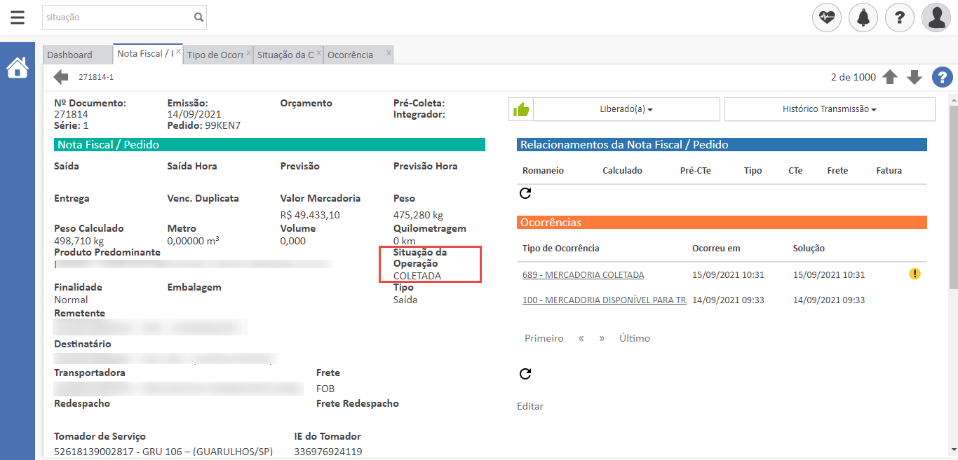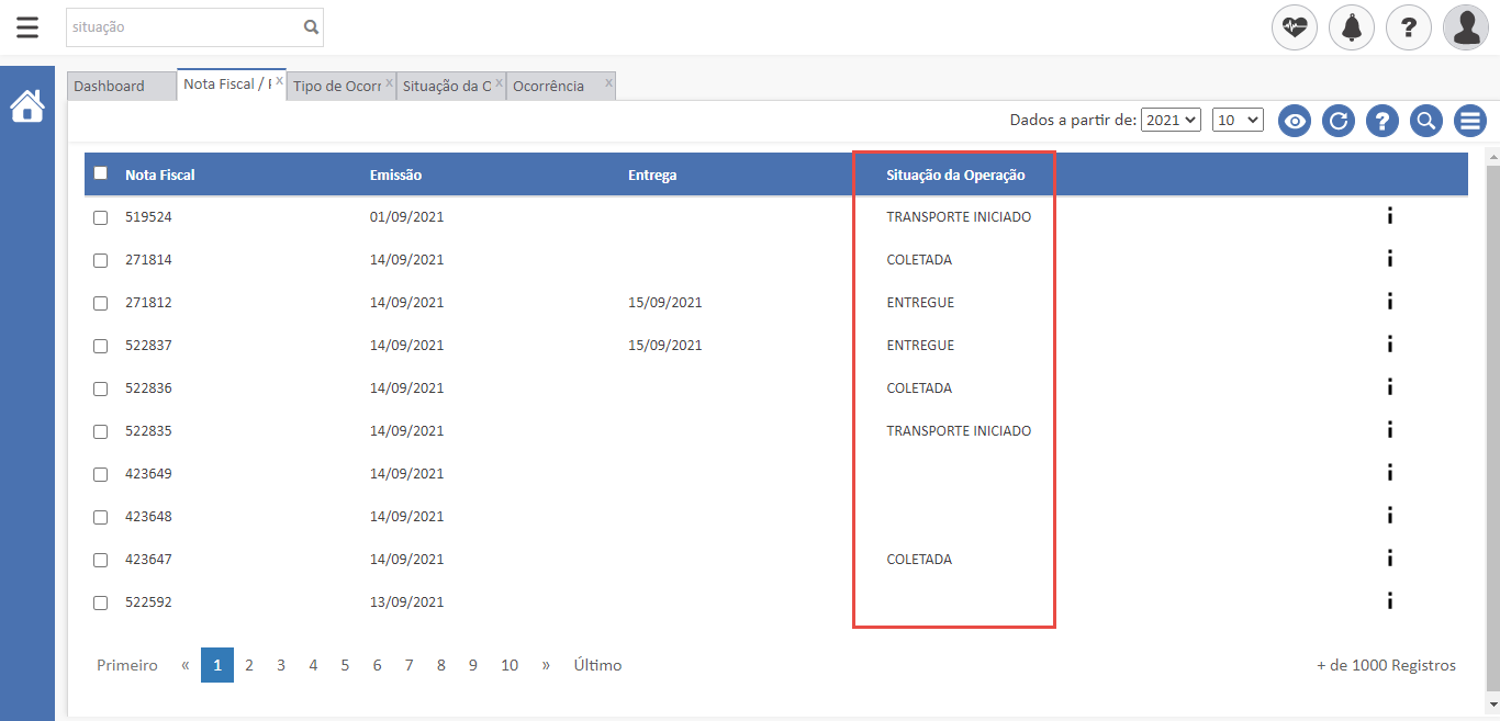 - Importante: Sempre que uma nova ocorrência for lançada e possuir a informação do Situação da operação, este status será atualizado na Nota Fiscal.