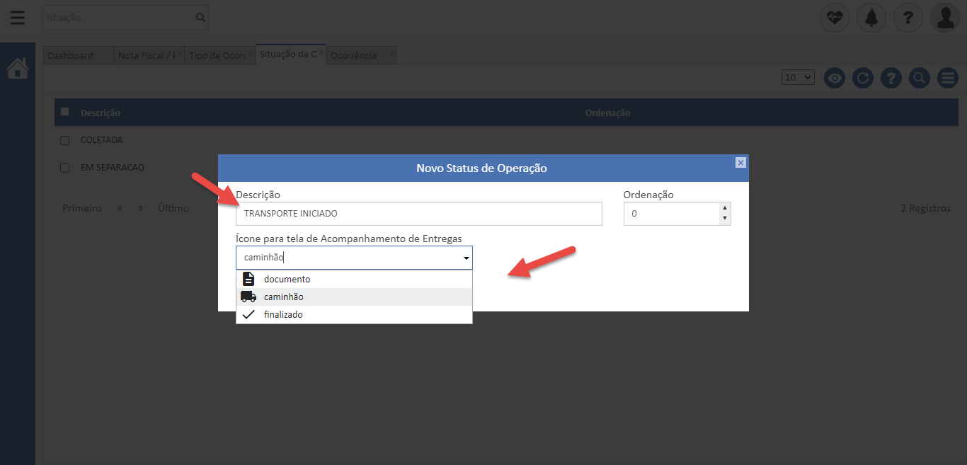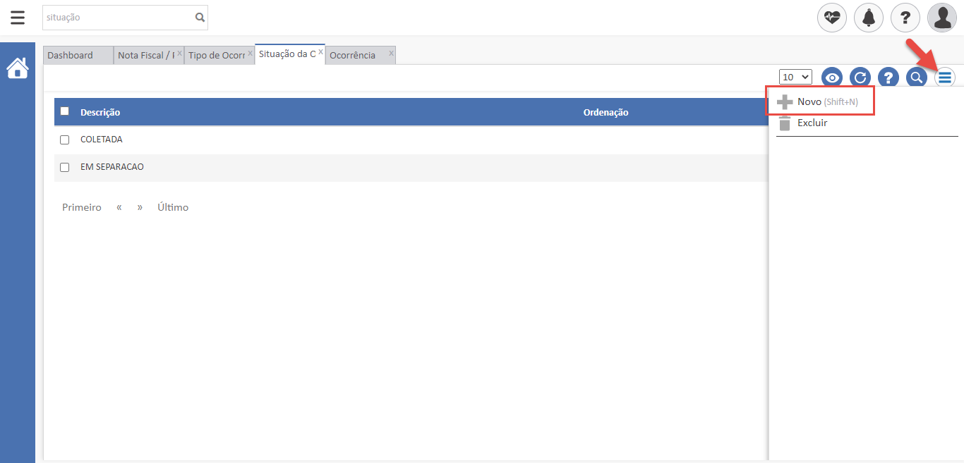 - Após isto, clique em “Novo” no menu para incluir a situação. Informe a descrição desejada e o ícone que será retornado no Acompanhamento de Entregas.