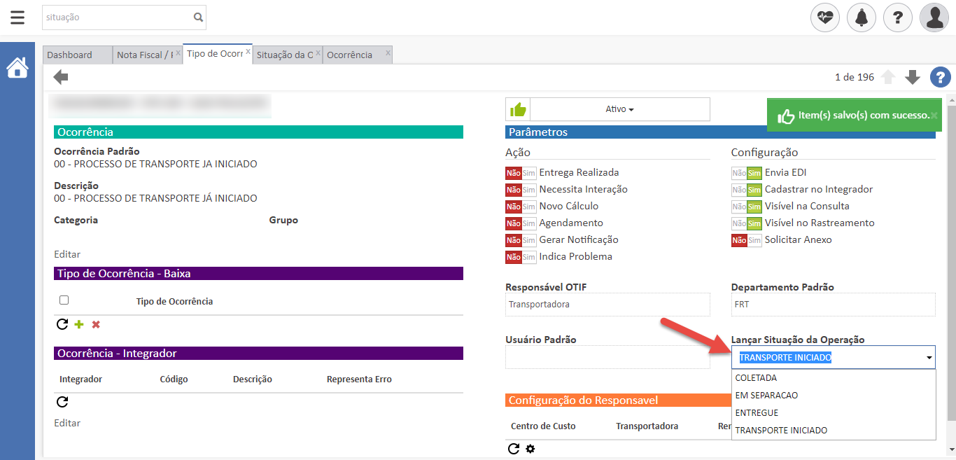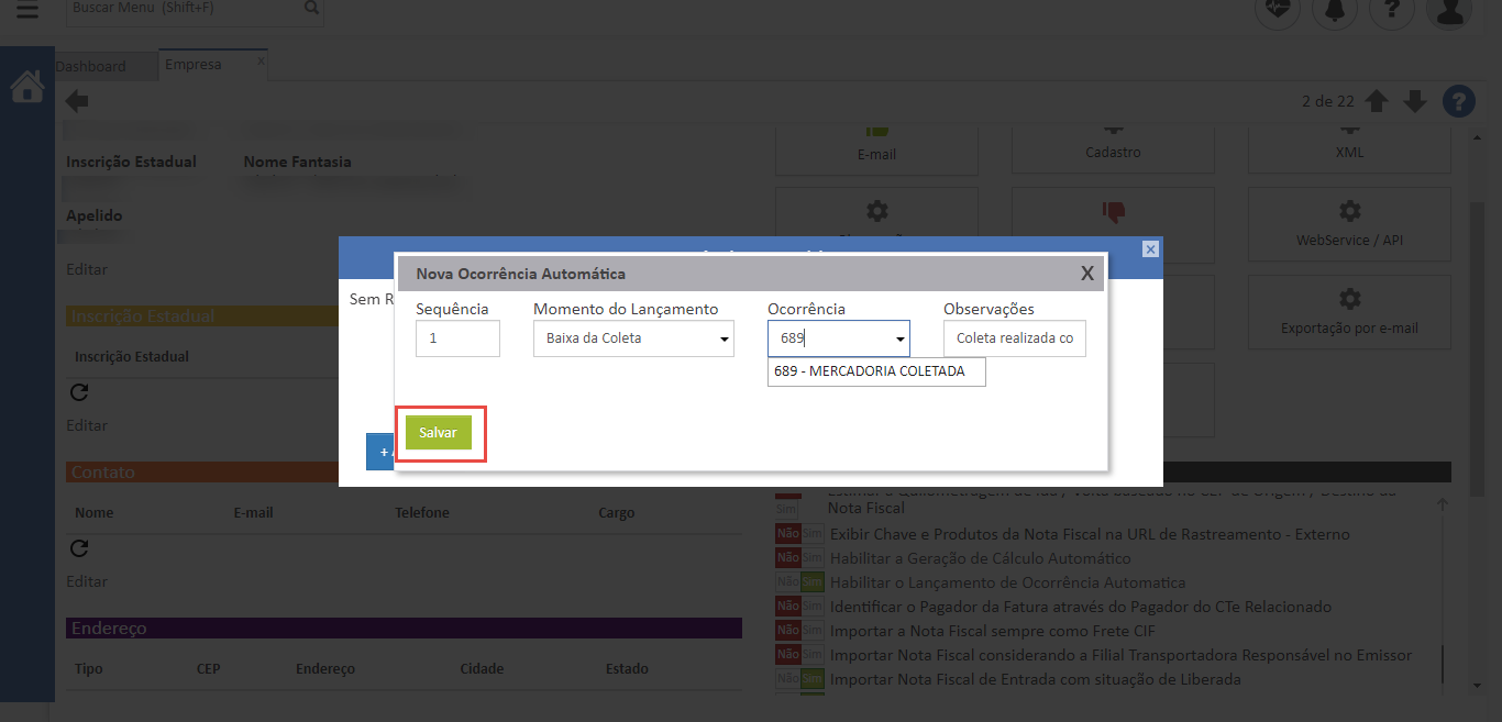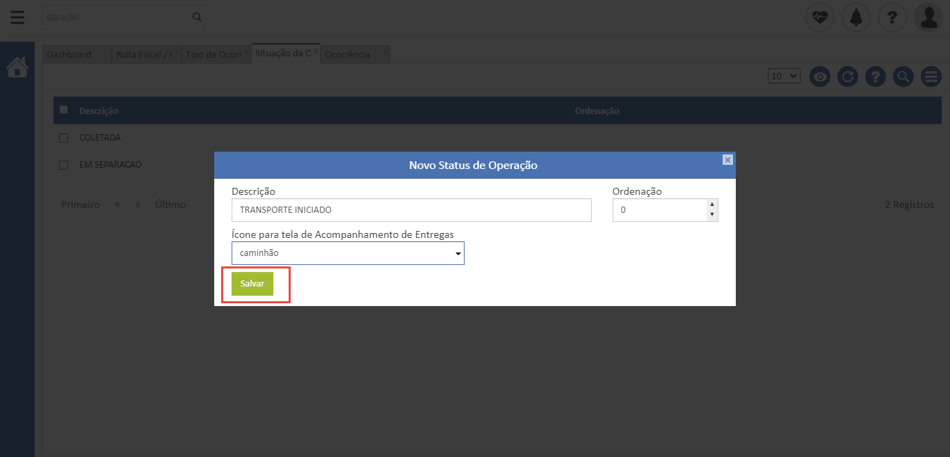 - Após isto, basta salvar e pronto! Sempre que você realizar a baixa de uma coleta, a ocorrência informada será lançada automaticamente.