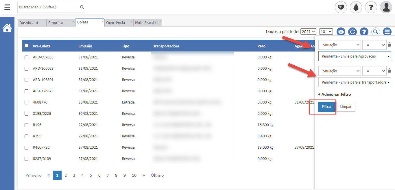 Para facilitar suas buscas no dia a dia, agora é possível realizar filtros como “Transportador” ou “Situação” na tela de Coletas mais de uma vez, buscando diferentes informações em uma mesma pesquisa.