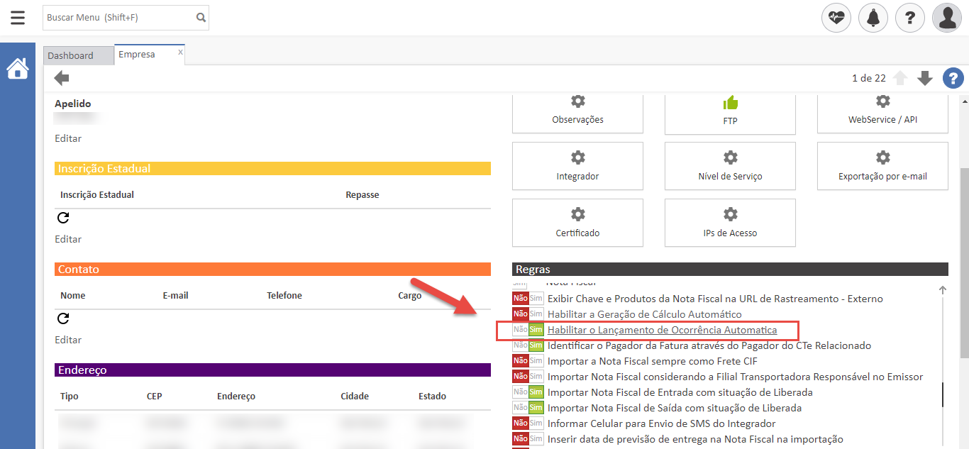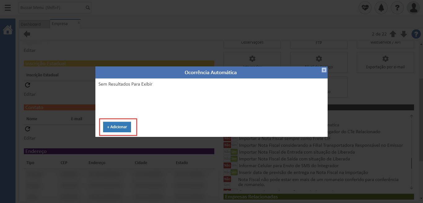 - Acesse a filial na qual a configuração será realizada e marque a opção “Habilitar o lançamento de ocorrência automática” como “Sim”. Após isto, clique na regra e em seguida em “Adicionar”;