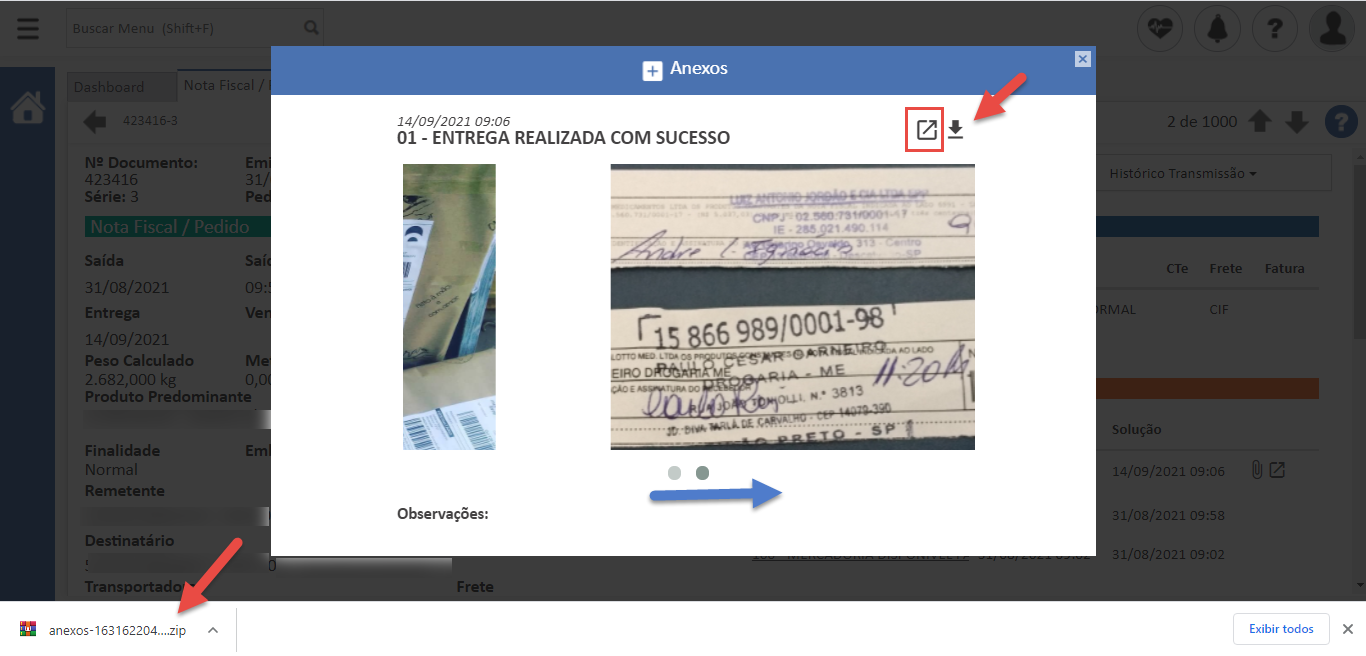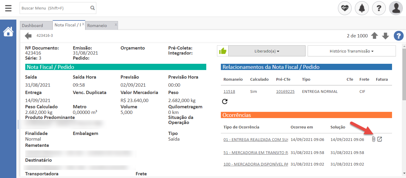 - Visualize os comprovantes de entrega e anexos das ocorrências na tela de Nota Fiscal/Pedido