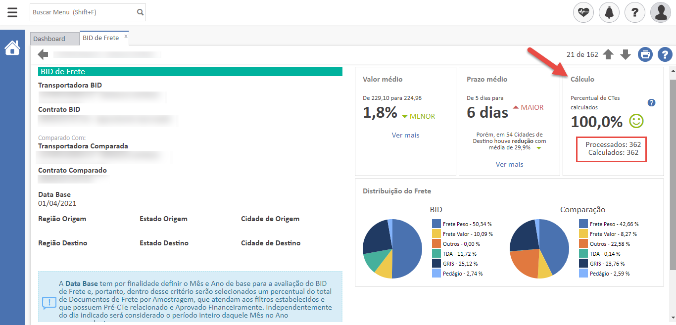 - Além disso, você também pode identificar em quais componentes de frete ocorreram reduções ou não, checando os Gráficos de Distribuição de Frete. No gráfico “BID”, são apresentados os dados da Transportadora BID, enquanto no “Comparação”, são apresentados os dados da Transportadora Comparada.